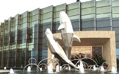 酒店不銹鋼雕塑以美為主,一般為裝飾性美陳景觀雕塑,常見于酒店大門、大堂、園林。包括但不限于水景景觀類,如圓環(huán)、噴泉、鏤空球;裝飾美陳類,如蓮花、翅膀、鵝卵石、水滴等。